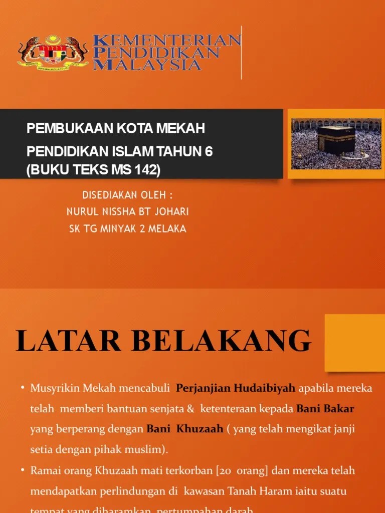 Kaabah kepada asalnya seperti yang dilakukan oleh nabi. Video penerangan tajuk 'kesan pembukaan kota mekah' dalam mata pelajaran sirah tahun 5 disampaikan oleh ustazah rahmah binti sulaiman pk . Ketenteraan kepada bani bakar yang berperang. E kerajaan islam di madinah semakin mantap f islam tersebar ke seluruh semenanjung tanah arab. Dan 12 musyrikin mekah terbunuh. Strategi dan taktik rasulullah yang berkesan, cekap dan bijak telah melemah dan melumpuhkan musyrikin mekah dari segi fizikal dan mental. Peristiwa pembukaan kota makkah bermula pada tanggal 10 ramadhan tahun. 1~ tanah haram mekah menjadi kawasan larangan kepada orang bukan islam. Rasulullah mengirim sepucuk surat kepada musyrikin mekah mengajukan 3 tuntutan iaitu : Peristiwa kemuncak ini berlaku apabila musyrikin makkah melanggar perjanjian hudaibiyyah yang telah dimeterai dengan orang islam. Kesan pembukaan kota mekah tanah haram mekah menjadi kawasan larangan kepada org bukan islam dapat membersihkan kaabah daripada amalan penyembahan .